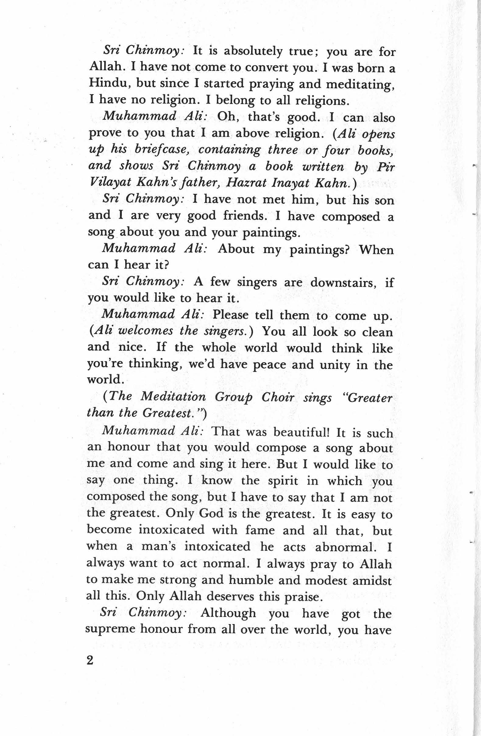 Muhammad. Ali: Oh, that’s good. I can also prove to you that I am above religion. (Ali opens up his briefcase, containing three or four books, and shows Sri Chinmoy a book written by Pir Vilayat Kahn’s father, Hazrat Inayat Kahn.)
