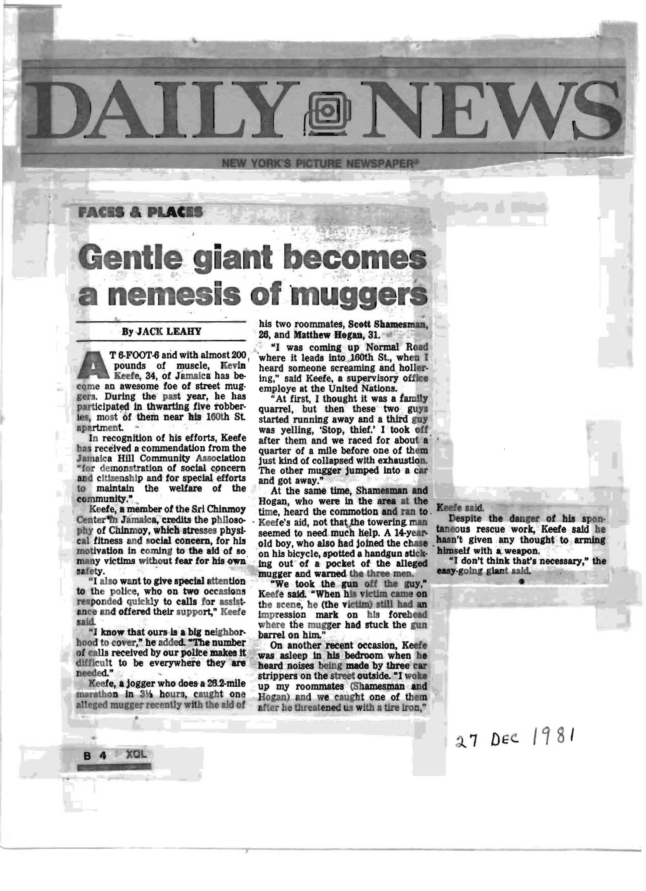 Community appreciates (Meditation Group member): muggers’ Nemesis, NY Daily News, 1981 Dec 27