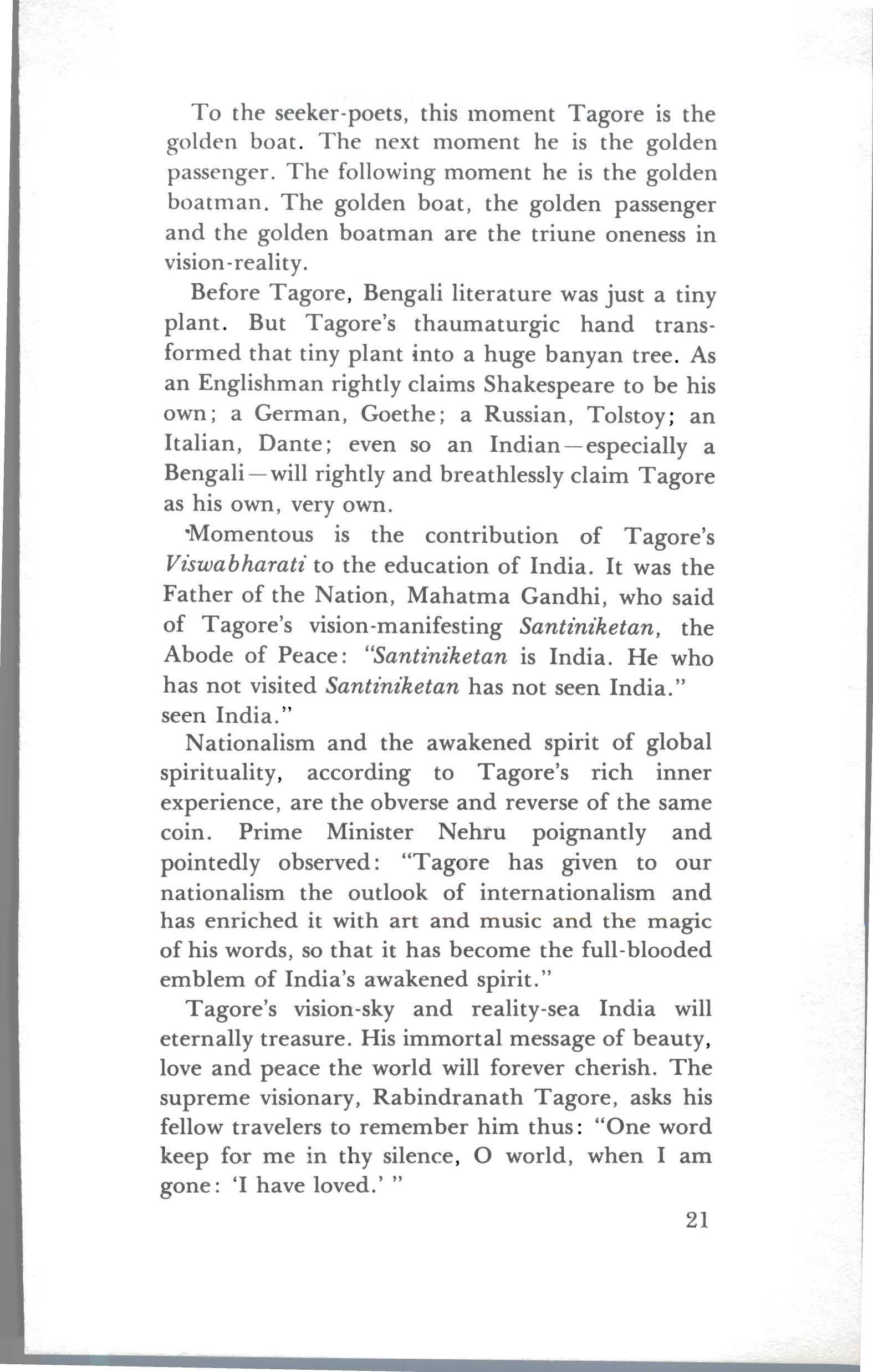 Tagore’s vision-sky and reality-sea India will eternally treasure. His immortal message of beauty, love and peace the world will forever cherish. The supreme visionary, Rabindranath Tagore, asks his fellow travelers to remember him thus : “One word keep for me in thy silence, O world, when I am gone: ‘I have loved.’ ”