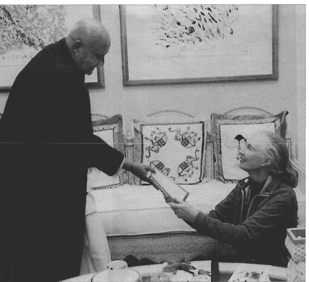 NOTED PRIMATOLOGIST GIVEN A LIFT Jamaica, NY- The renowned animal researcher and environmentalist, Dr. Jane Goodall, famous for her studies of chimpanzees in the wild, visited Sri Chinmoy April 18 at Aspiration-Ground. After being lifted by the spiritual leader, Dr. Goodall said: “I feel very grateful, very humble and very happy to be here.” Sri Chinmoy called her “a supreme messenger of peace and hope.” He added: “With hope we are still alive, and with hope we shall be able to fulfill our promise.. .of a oneness-world.” Before leaving, Dr. Goodall demonstrated a chimpanzee greeting call. Below: Sri CIzim7og presents a book to actor to chimpanzee re.searcher. Dr. Jane Goodall, at Pilgrim-House As noted in Anahata Nada April – July 2003
