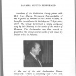 - PANAMA MOTTO PERFORMED: Members of the Meditation Group joined with H.E. Jorge Illueca, Permanent Representative of the Republic of Panama to the United Nations, in his office to celebrate his birthday on 17 September 1979. The Group performed a newly composed song by Sri Chinmoy to the words of the motto of Panama. The Ambassador was then moved to present to the Group several works of art, made by Indian tribes in Panama. 9